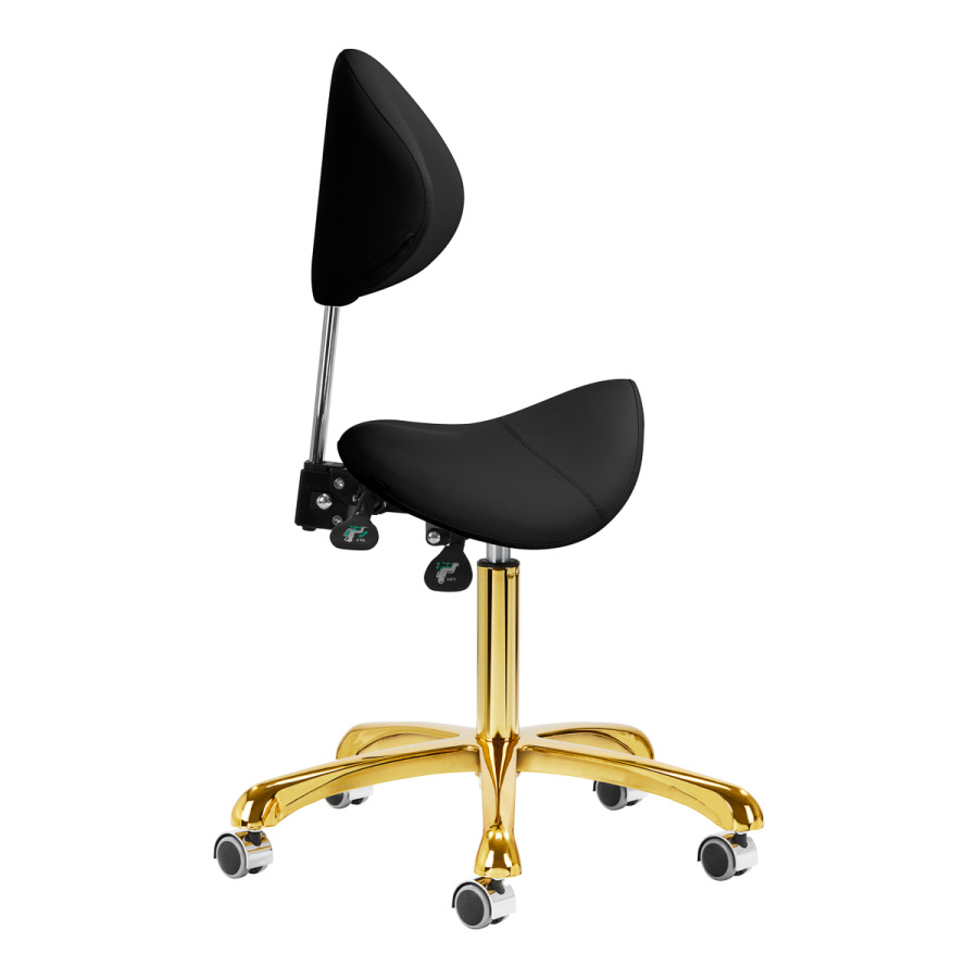 Pięcioramienna, odpowiednio zaprojektowana podstawa w odcieniach złota sprawia, że taboret jest stabilny, nawet podczas intensywnej pracy. Kółka zapewniają znaczną mobilność, co ułatwia przemieszczanie mebla po gabinecie. Obicie wytrzymałego taboretu wykonano z imitacji skóry w odcieniach czerni. Dzięki użyciu takiego materiału taboret jest odporny na wilgoć i łatwy w czyszczeniu.