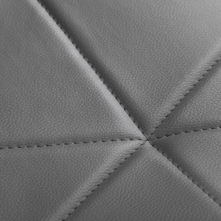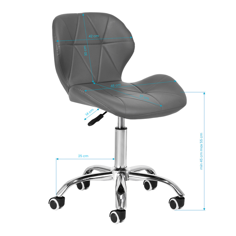 Pięcioramienna podstawa w odcieniach chromu wyposażona jest w gumowane kółka, które zapewniają znaczną mobilność, umożliwiając swobodne przemieszczanie mebla po gabinecie. Siedzisko taboretu zostało obite przyjemną w dotyku imitacją skóry w eleganckim odcieniu szarości. Zastosowany materiał gwarantuje trwałość, odporność na wilgoć oraz łatwość w utrzymaniu czystości. Całość dopełniają stylowe przeszycia, które podkreślają nowoczesny design.