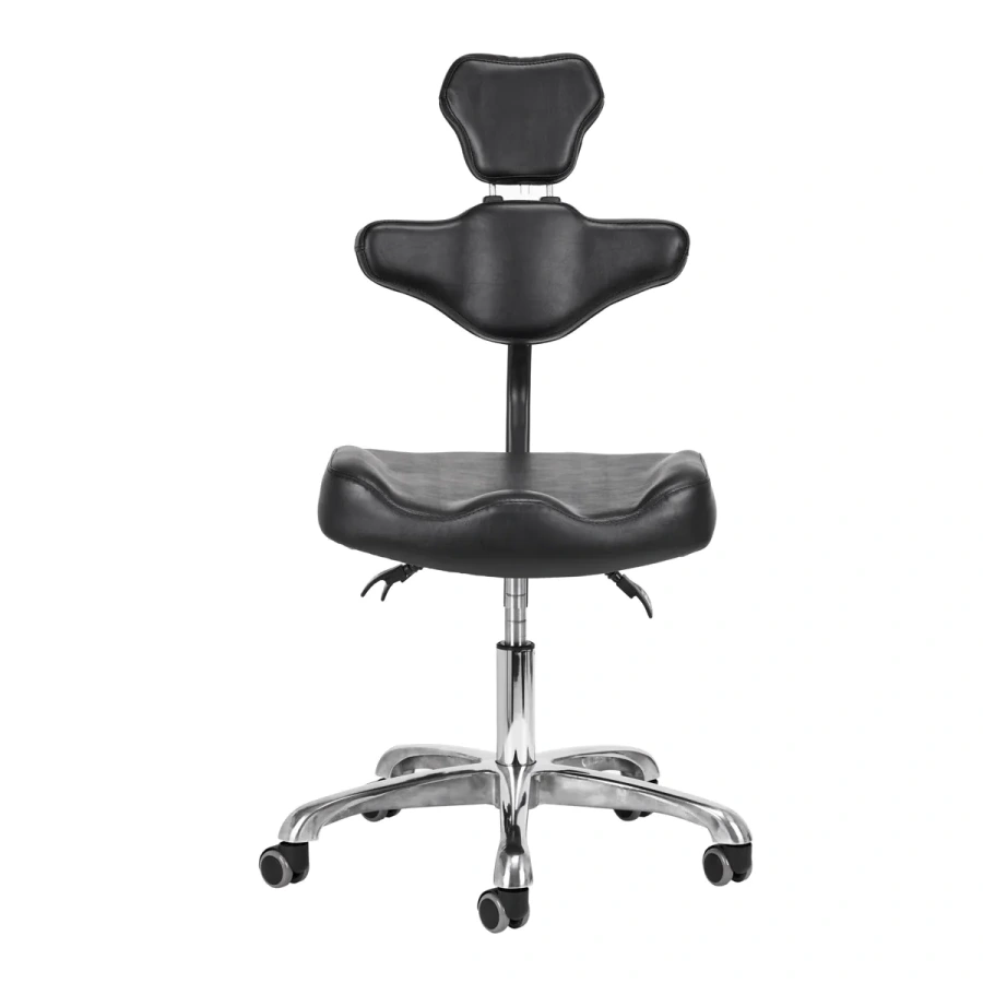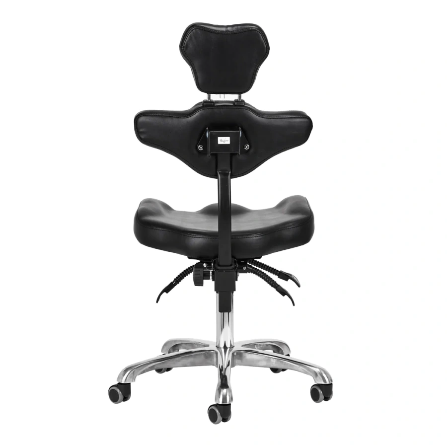 Stolička sa ľahko otáča a umožňuje plynulý pohyb bez nutnosti vstávať. Poloha „obkročmo“ poskytuje výbornú oporu pre hrudník a lakte – ideálne pri dlhých, detailných tetovaniach.