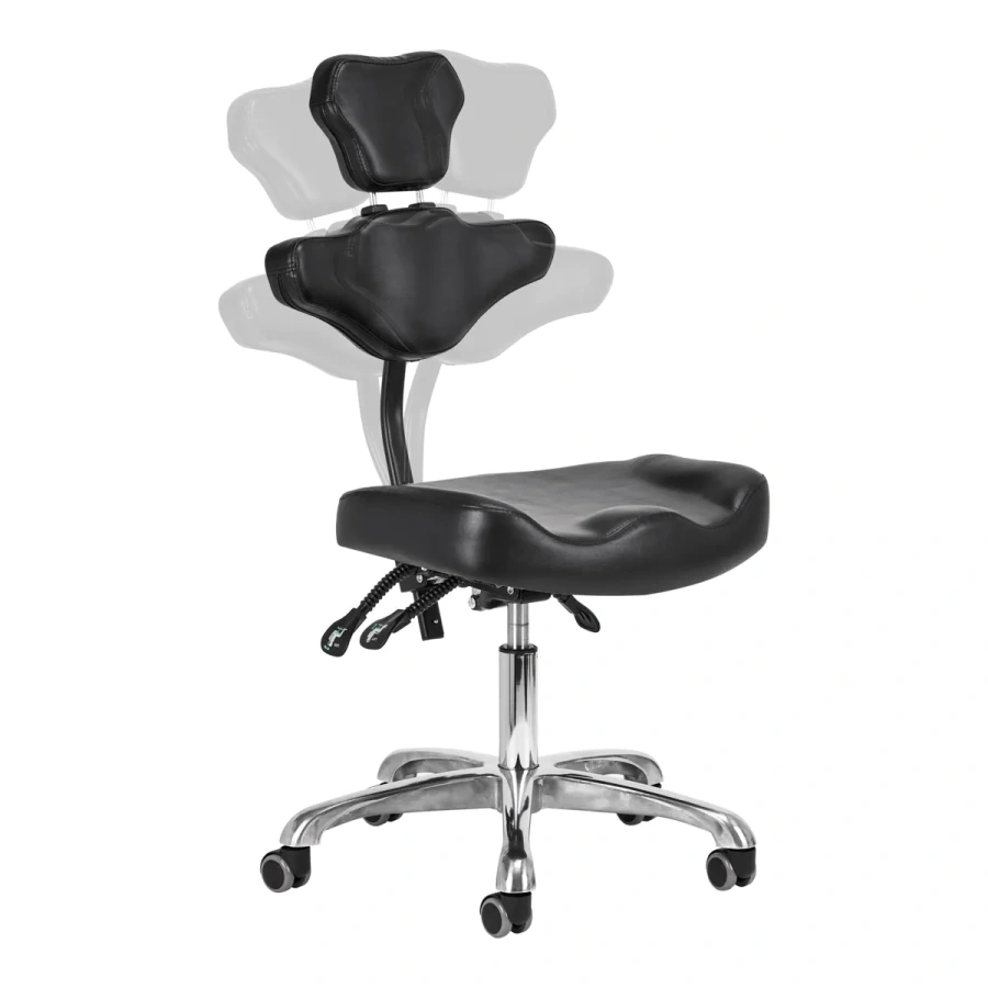 Päťhviezdičková základňa zabezpečuje stabilitu počas používania. Účinné kolieska umožňujú voľný pohyb stoličky, vďaka čomu ľahšie dosiahnete na potrebné pomôcky a zaujmete správnu pracovnú polohu. Profilované sedadlo a operadlo sú vyplnené odolnou penou a čalúnenie je vyrobené z imitácie kože v čiernych odtieňoch. Vďaka použitým materiálom sa stolička ľahko čistí, čo pomáha udržiavať vysoké hygienické štandardy. Vďaka svojmu netradičnému vzhľadu stolička dokonale zapadá do špecifickej estetiky tetovacích salónov.