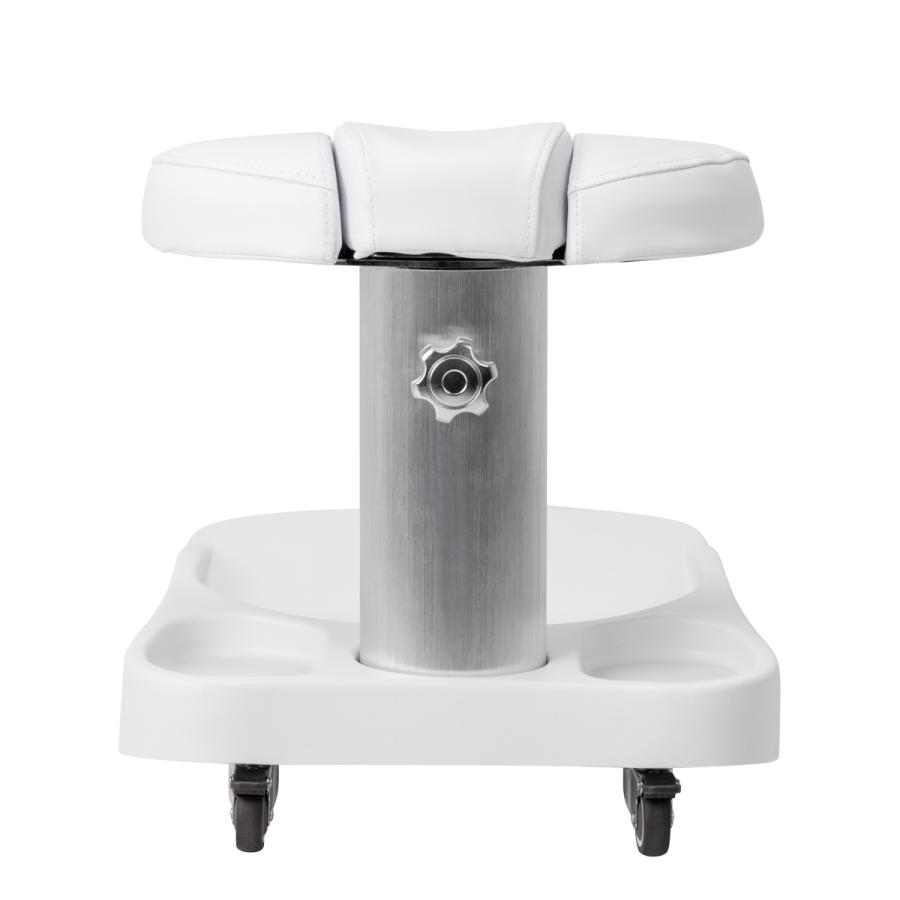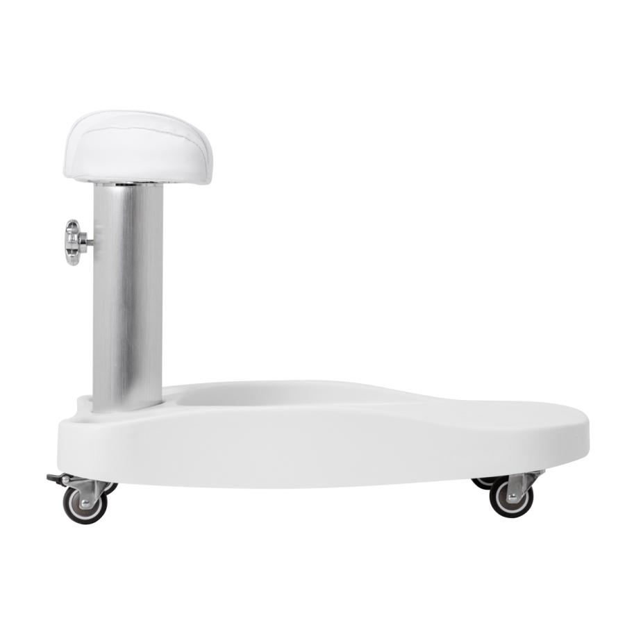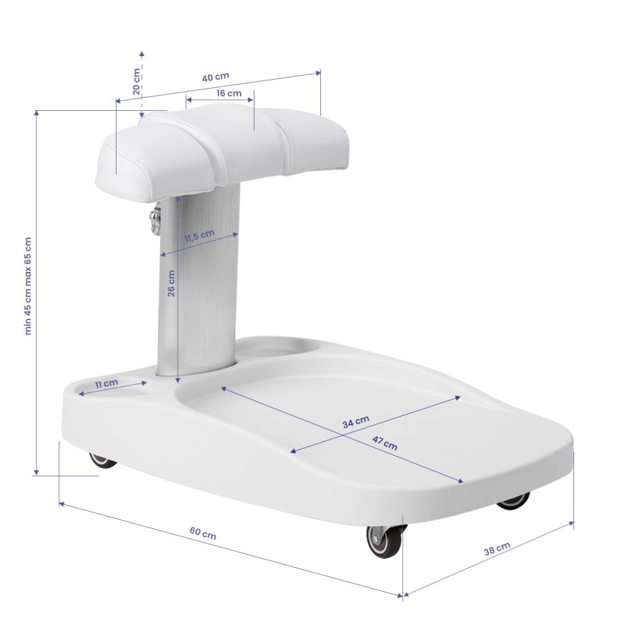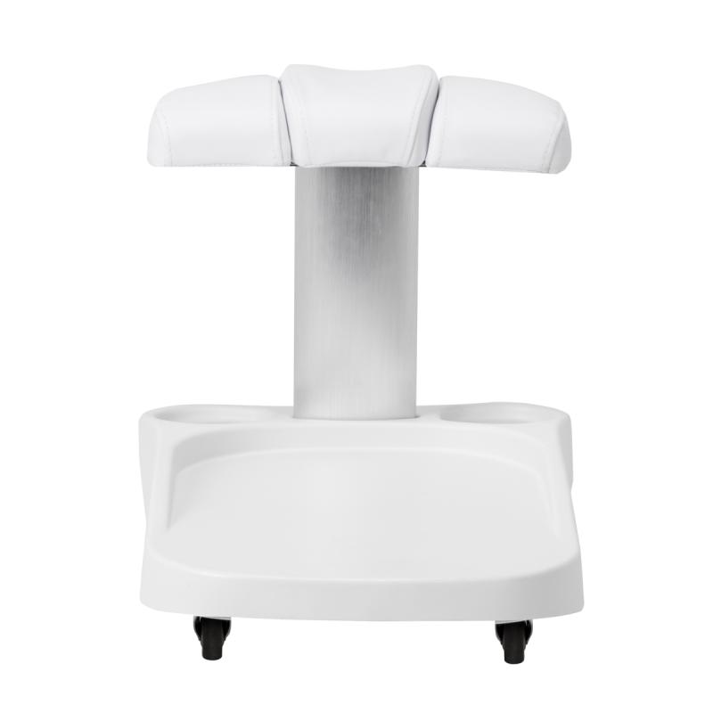 Podnožka sa skladá z troch častí, z ktorých stredná je výsuvná. Je manuálne výškovo nastaviteľná, čím ju možno zdvihnúť až o 20 cm. Všetky časti podnožky sú čalúnené syntetickou kožou, ktorá zaručuje odolnosť voči vlhkosti a jednoduché čistenie. Vďaka tomu možno vozíkprispôsobiť individuálnym potrebám používateľa, čo z neho robí vynikajúce riešenie na kozmetické aj podiatrické ošetrenia, ktoré zabezpečujú pohodlie a presnosť v rôznych polohách.