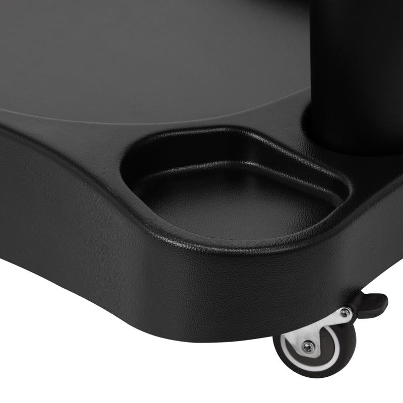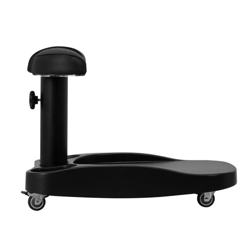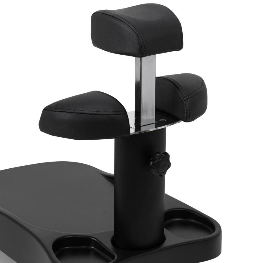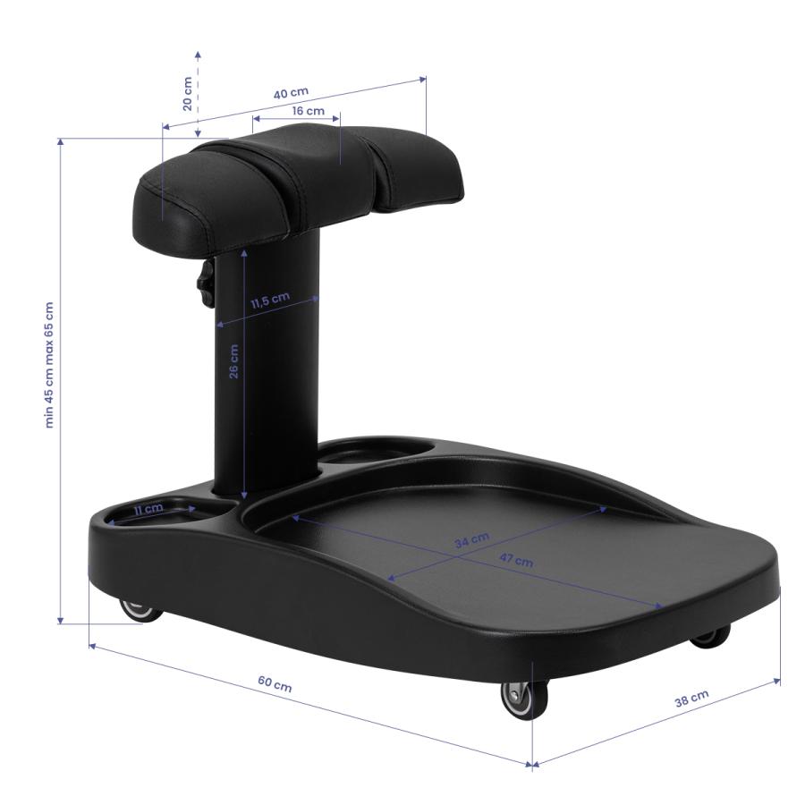 Podnožka sa skladá z troch častí, z ktorých stredná je výsuvná. Je manuálne výškovo nastaviteľná, čím ju možno zdvihnúť až o 20 cm. Všetky časti podnožky sú čalúnené syntetickou kožou, ktorá zaručuje odolnosť voči vlhkosti a jednoduché čistenie. Vďaka tomu možno vozíkprispôsobiť individuálnym potrebám používateľa, čo z neho robí vynikajúce riešenie na kozmetické aj podiatrické ošetrenia, ktoré zabezpečujú pohodlie a presnosť v rôznych polohách.
